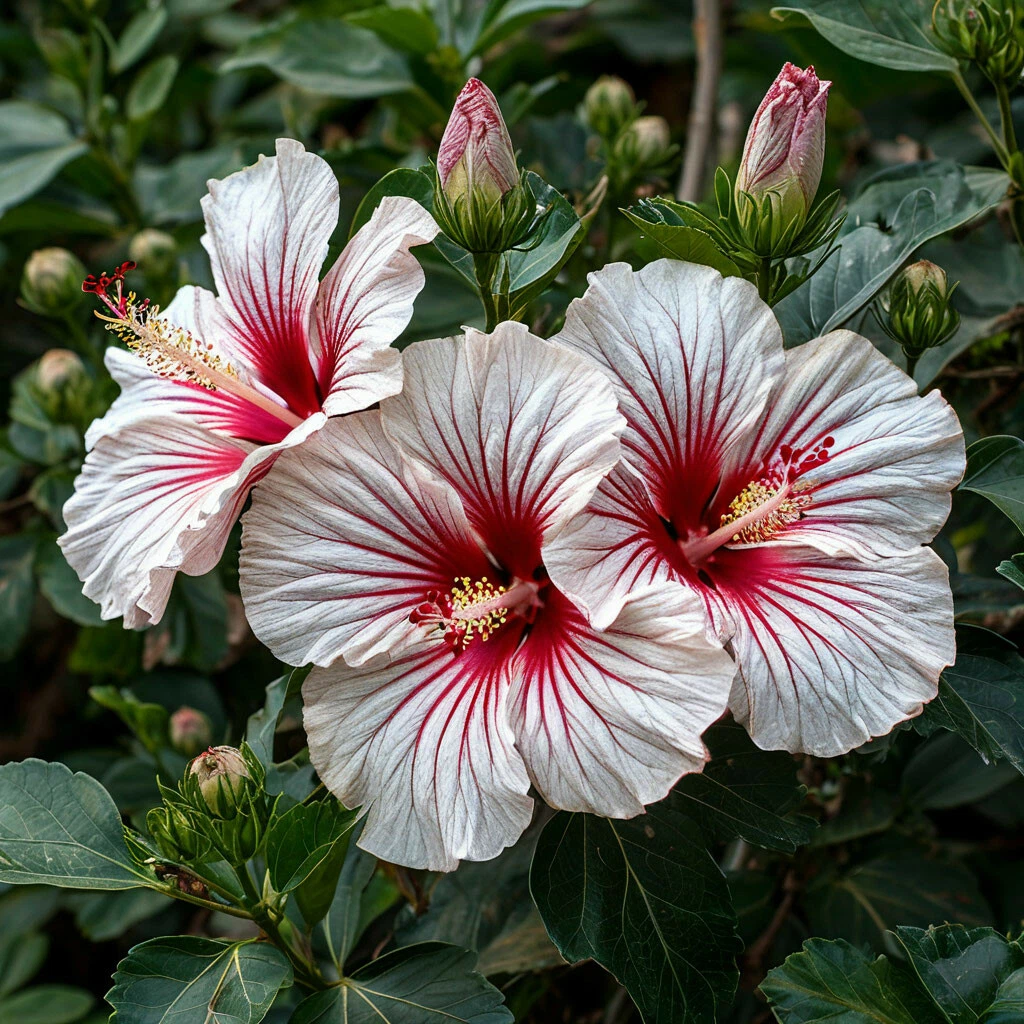 Гибискус «Рэд Элеганс» — это воплощение изящества и грации. Представьте: крупные белоснежные цветки, украшенные тонкими красными нитями, словно рубиновые прожилки, пронизывающие нежный фарфор. Этот гибискус словно создан для того, чтобы подчеркнуть изысканность и элегантность вашего сада. Его красота завораживает и дарит ощущение гармонии и совершенства.